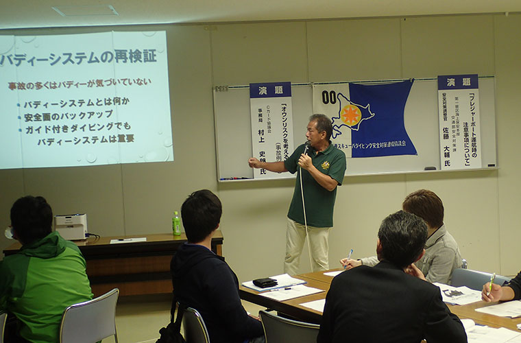 「ダイビング安全対策セミナー2018」が、かでる2・7にて開催されました。80名以上の方々にお越しいただき盛況のうちに終わる事が出来ました。今年も多数のご参加ありがとうございました。 そして、ご登壇いただきました講師・先生におかれましては 貴重な講演を心より感謝申し上げます。 ・主催:北海道スキューバダイビング安全対策連絡協議会 ・開催:平成30年11月16日(金)/札幌「かでる2・7」) ・演題/講師: 「海で死なないダイバーの育成」 村上 史郎 氏(Cカード協議会) 「パラオの海の探求と楽しみ方」 秋野 大 氏((株)デイドリームパラオ代表取締役) |